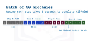 them all. I can do about 10 of them per minute, so it takes me five more minutes, plus the five minutes from before. Now I’m 10 minutes into it. Once I have them all folded and inserted, I move on to the next step, which is sealing them all. If I’m sealing 10 per minute, I can do another 50 in another five minutes. So, I’m up to 15 minutes at this point in wall clock time. Finally, I get to step four, stamping, and it took me 16 minutes to get my first finished product. This is the first time I have things that I can actually inspect to check the quality. What if the envelopes had no glue? It would be 11 minutes before I figured out that something went wrong. What if there’s a typo on the brochure? I have to go all the way back to the beginning. So, this is very wasteful work in these large batches.