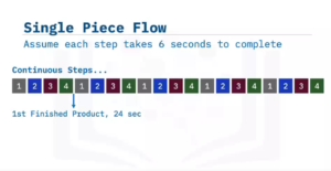 Now let’s look at the same example with small batches using single-piece flow. Again, assume each step takes about six seconds to complete. With single-piece flow, I fold one, put it into the envelope and seal it and put a stamp on it and the first finished product is in about 24 seconds. Now I can inspect it, see if it works, see if it’s what I thought it was, and then let the rest of the flow continue if it was acceptable. I received fast feedback in only 24 seconds instead of 11 minutes with the large batch. What if the envelopes had no glue? I would find out after 18 seconds. And if there was a typo in the brochure, after 24 seconds. It’s very important that we don’t work in large batches.